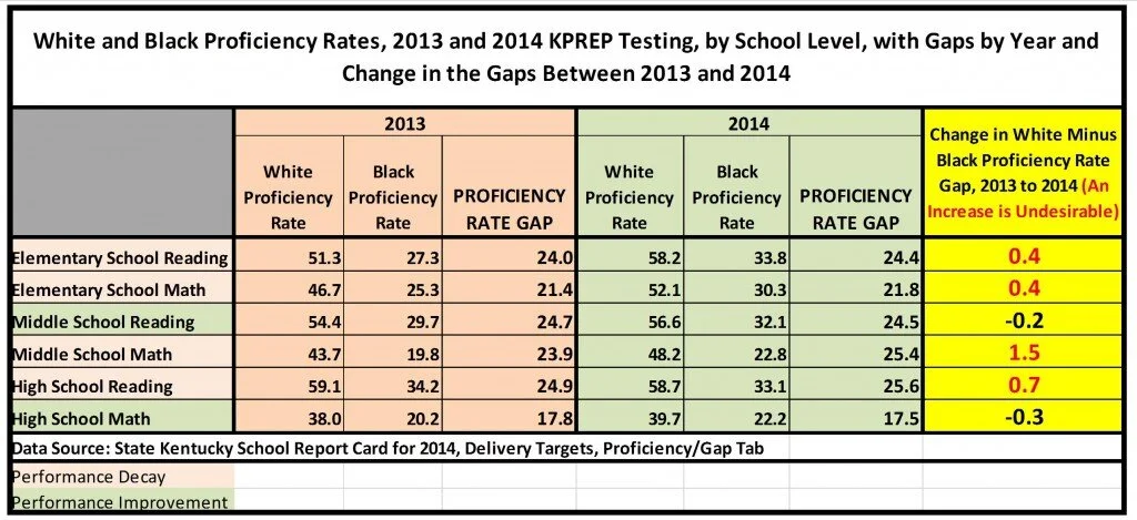 Furthermore, the latest KPREP black proficiency rates in 2014 indicate only about one in three, and sometimes closer to just one in four, black students in Kentucky are meeting proficiency targets.